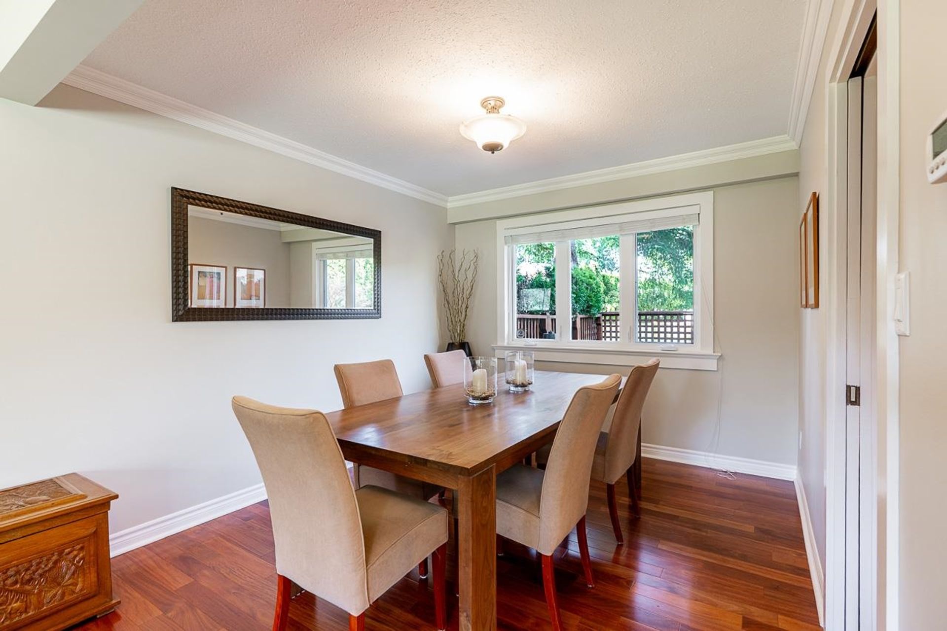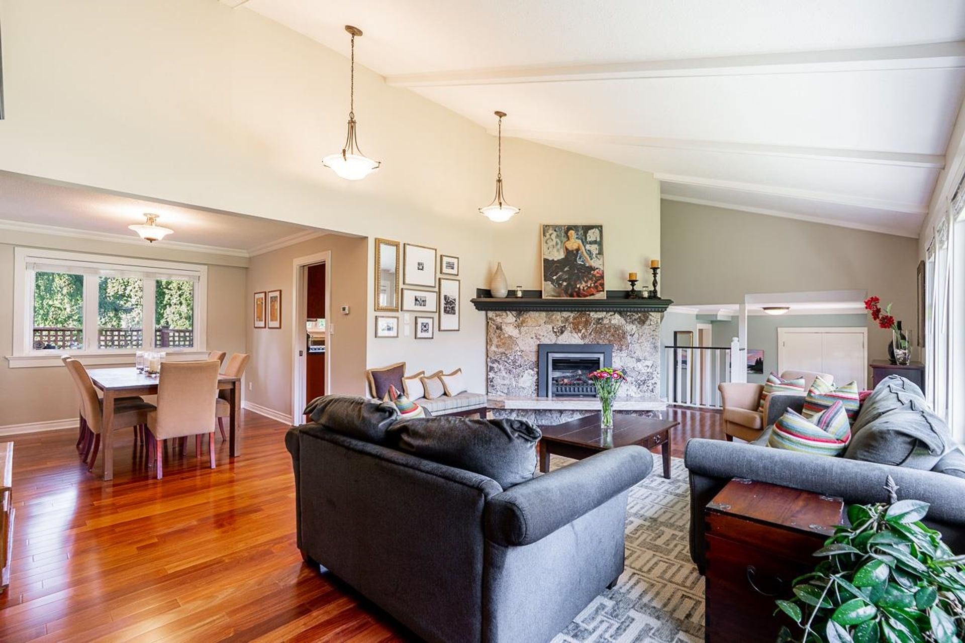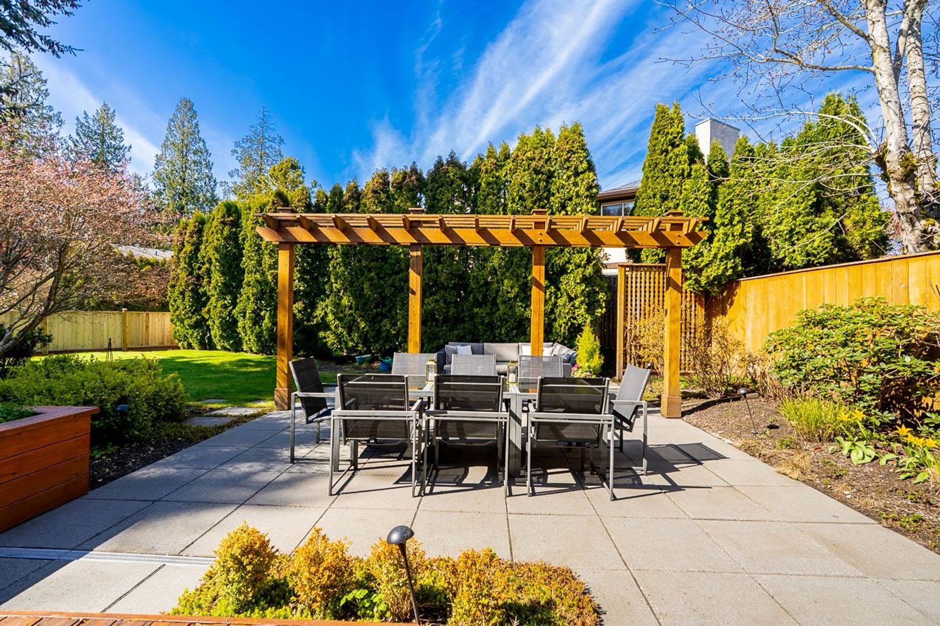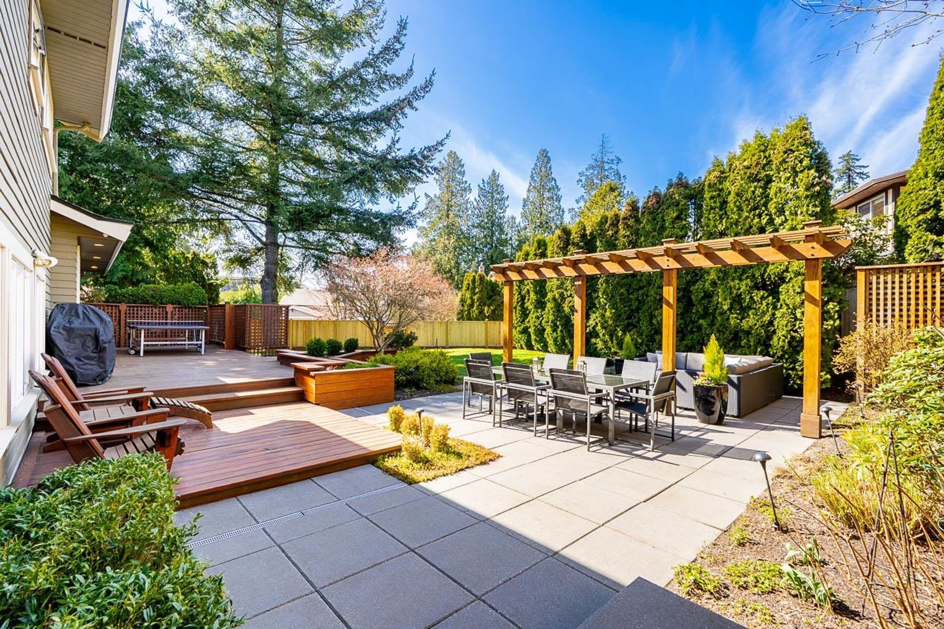 Lovely 2,300 sf 3-level split home on a 9,678 sf lot with convenient lane access, nestled on a quiet cul-de-sac. Thoughtfully updated and meticulously maintained, this home offers a fantastic floor plan with beautiful Santos mahogany hardwood throughout. Enjoy seamless flow from the formal vaulted living and dining areas to the bright eat-in kitchen, overlooking a spacious family room and private backyard. Upstairs features 3 beds, 2 full baths & den (potential 4th bed). Oversized laundry and ample storage add convenience. Professionally landscaped yard with patios for dining, lounging, and play. Recent updates include roof, fencing, and A/C. Walk to coveted schools HT Thrift and Semiahmoo (IB Program). Close to parks, recreation, beaches, shops, and dining - an exceptional lifestyle!