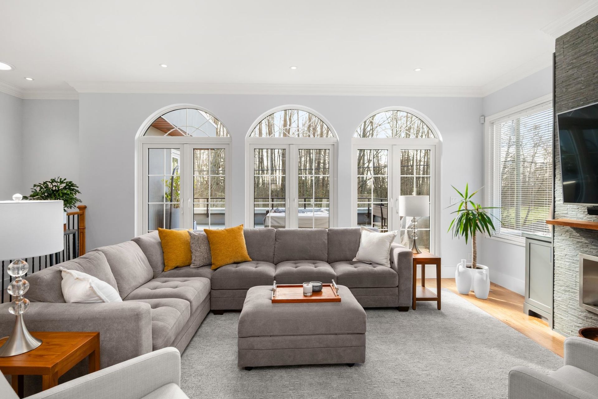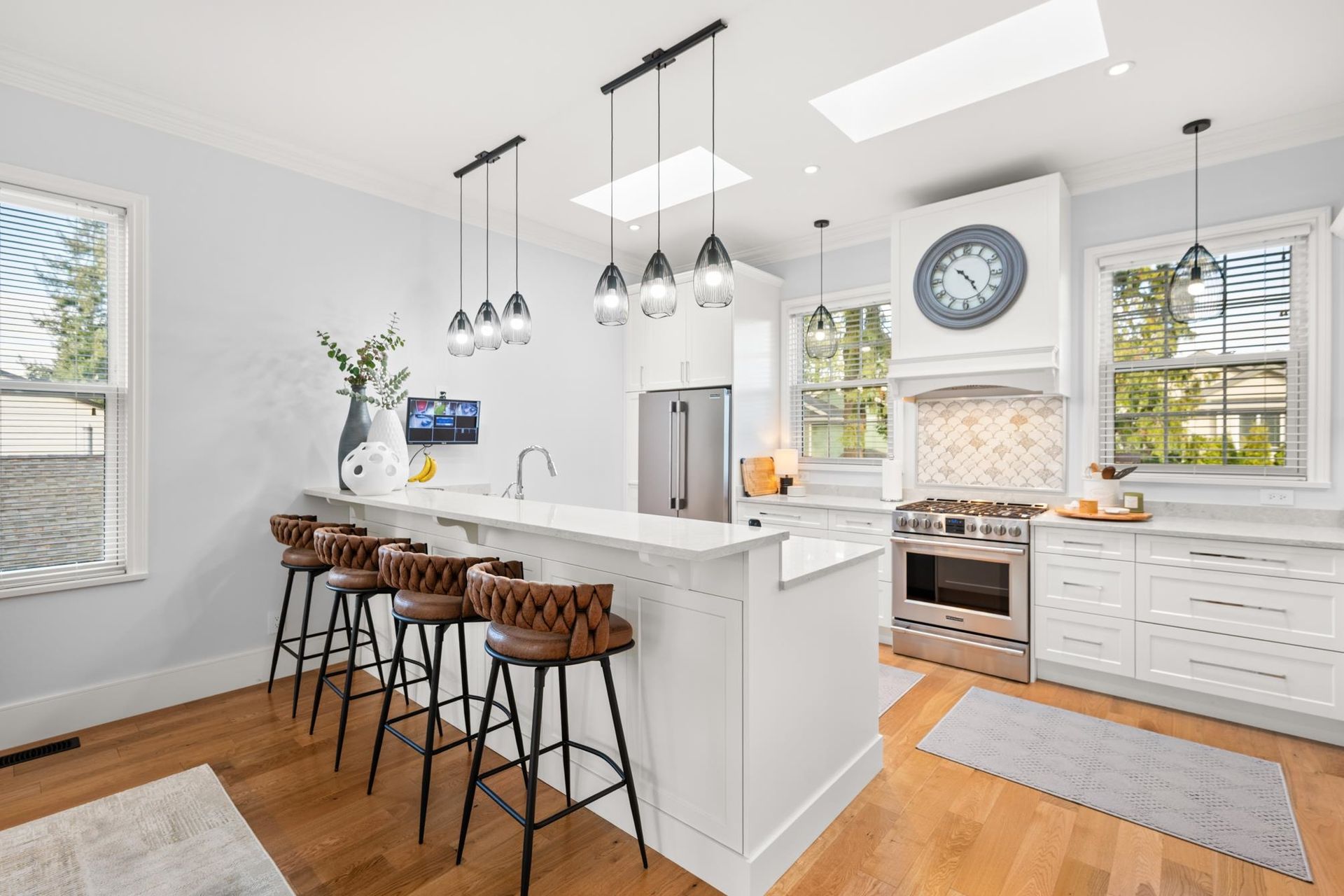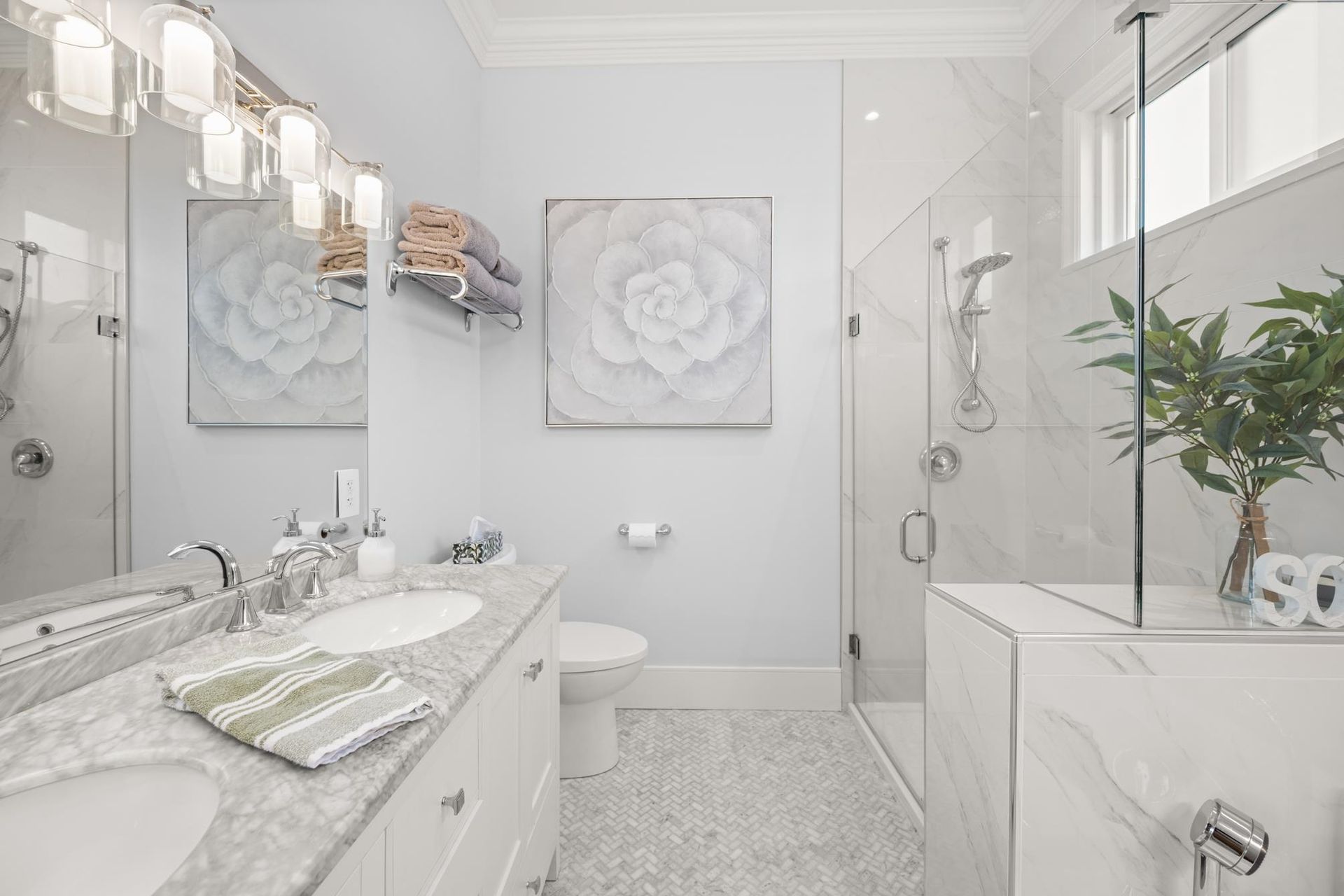 Stunning custom-built home offering 3,230 SF on a 6,200 SF lot in Pacific Douglas, overlooking Peace Arch Park. Upper main floor features 10-ft ceilings with skylights, is surrounded by windows, and opens to 800+ SF of decks. Enjoy open living, dining, and kitchen with a separate prep and pantry area, plus a home office, all showcasing quality custom finishings and exceptional attention to detail. The impressive primary suite includes a fireplace, spa-like ensuite, and spacious walk-in closet. Downstairs offers 3 ensuited bedrooms and a recreation room with sauna—ideal for multigenerational living. Walk out to a beautifully landscaped yard with garden beds and a potting shed. Oversized garage with flex space, perfect for a workshop. An exceptional balance of quality, space, and lifestyle!